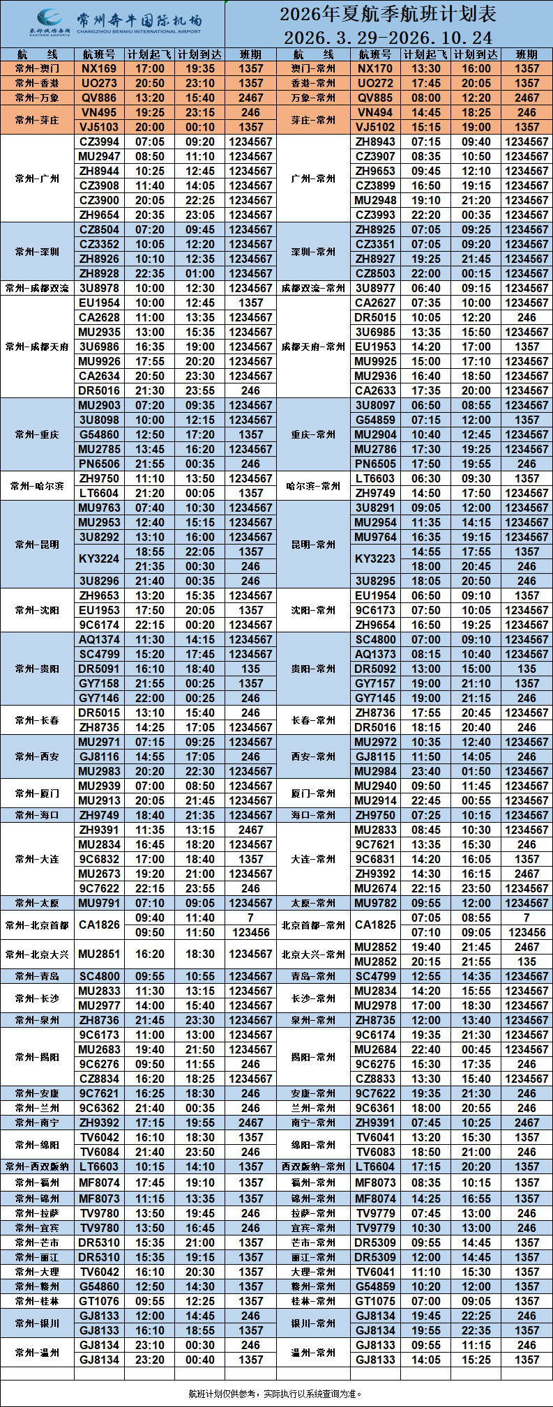 常州奔牛国际机场2026年夏航季航班计划表(2026年3月29日-2026年10月24日)